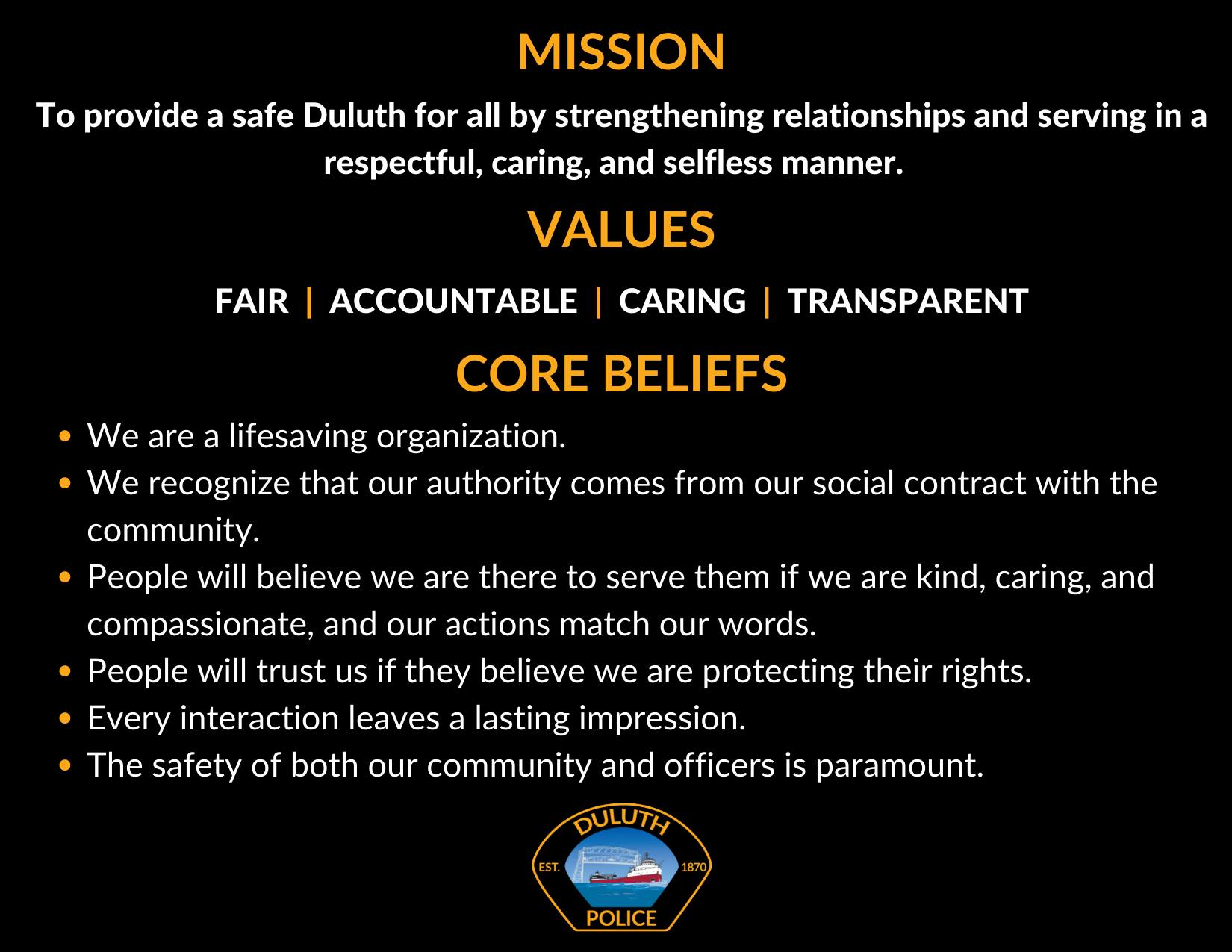 The Duluth Police Department is the third-largest municipal police department in Minnesota and is nationally recognized due to our innovative policing programs. A primary focus at the Duluth Police Department is community policing and working with our community to build partnerships for effective problem-solving and crime prevention. The department has an authorized strength of approximately 158 police officers and 40 support staff. Our 2025 budget is set at $29,258,000. The department is divided into three divisions: the Patrol Division, the Investigative Division, and the Administrative Division.