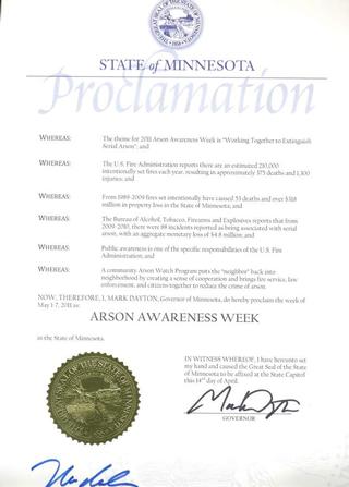 In Minnesota, 1,268 arson fires were reported in 2009. They included 330 structure fires and 159 vehicle fires, with a total dollar loss of more than $6 million. Figures reported to the State Fire Marshal by local fire departments show that only six of Minnesota’s 87 counties experienced no arson fires that year. Since 1989, arson fires in our state have caused at least 53 deaths and more than $318 million in property destruction.