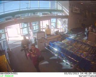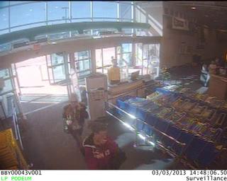 On Sunday, March 3rd, 2013 at approximately 2:30 PM to 3:00 PM there was a vehicle prowl at the Snowflake Nordic Ski Center, 4348 Rice Lake Road, where suspect(s) broke a vehicle’s window to steal a purse inside. The suspect(s) then went to Best Buy and Dunham’s Sport and purchased over $1,000 worth merchandise. The two suspects are both female – one has brown hair and is wearing a red sweatshirt and the other has blonde hair and is wearing a black jacket with a fur collar. The suspect’s images were captured on a surveillance camera.