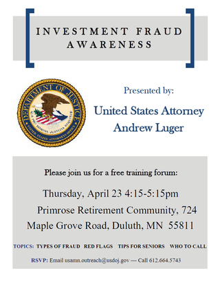 The United States Attorney Andrew Luger will be in Duluth Thursday, April 23rd, 2015 and will hold a meeting 4:15 – 5:15 p.m. at Primrose Retirement Community conducting public awareness training on investment fraud. The training will be a briefing designed to provide information on what law enforcement is doing and how to better protect yourself.