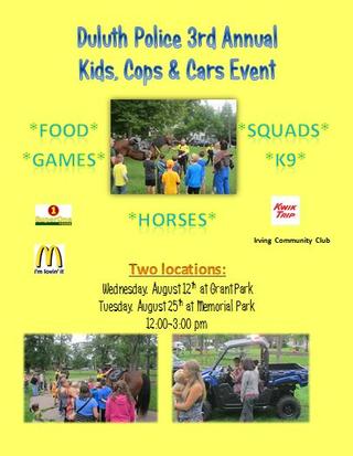 The Duluth Police Department will be hosting their 3rd Annual Kids, Cops, and Cars Event this Wednesday, August 12th 2015 at Grant Park. There will be food, games, squad cars, K9 Officers, mounted patrol horses and much more. Hope to see you there!