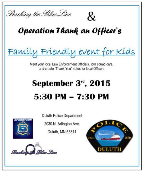 Backing the Blue Line Organization is hosting Operation Thank an Officer event at the Duluth Police Department located at 2030 Arlington Avenue in Duluth. At this event, you will be able to meet local law enforcement officials from surrounding agencies and create "thank you" notes for local officers. There will also be squad cars on display, Duluth Police Mounted Horse Patrol, Duluth K9 Officers with their partners and more. For more information, visit their website at http://www.backingtheblueline.org/