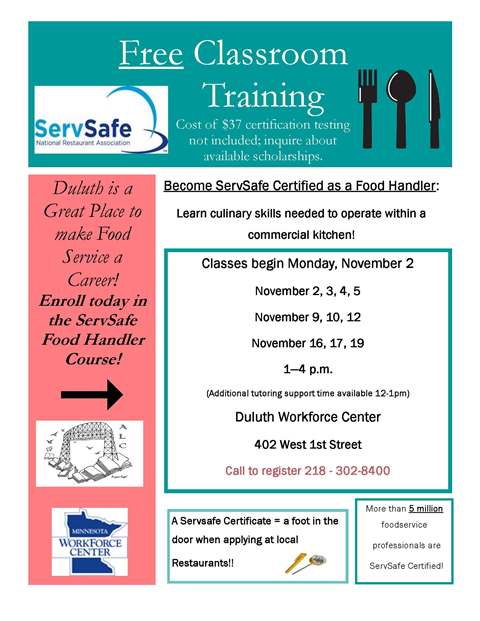 [Duluth, MN] - The Duluth Workforce Center is partnering with the Minnesota Workforce Center and the National Restaurant Association to offer free classes for those individuals interested in working in the food service industry. ServSafe classes train people on the rules and regulations of safe food management for commercial kitchens. Upon passing the test, participants will receive a Servsafe Certificate which is helpful to gain employment at restaurants. The multi-day classes will be offered starting November 2 and run from 1-4 PM each day. Please contact the Duluth Workforce Center to register.