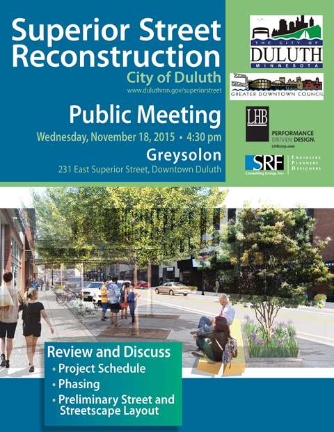 [Duluth, MN] - The City of Duluth Planning Division invites the 6th in a series of public meetings to discuss the planned reconstruction of Superior Street between 6th Ave West and 4th Ave East in downtown Duluth. The meeting will take place on November 18, 2015 at 4:30 PM at the Greysolon, 231 East Superior Street. City staff and consultants will present the project schedule, review the various phases of the project and provide a preliminary street design and layout. The final design is to be finalized in 2016 with anticipated construction to start in 2017 or 2018.