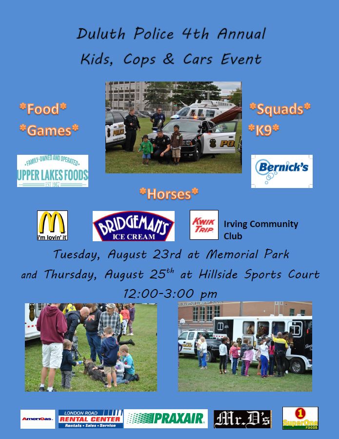 Duluth Police Department is hosting the 4th Annual Kids, Cars and Cops Event. There will be food, games, emergency vehicles on display, K9 and mounted patrol. There will be two locations this event will be held at: