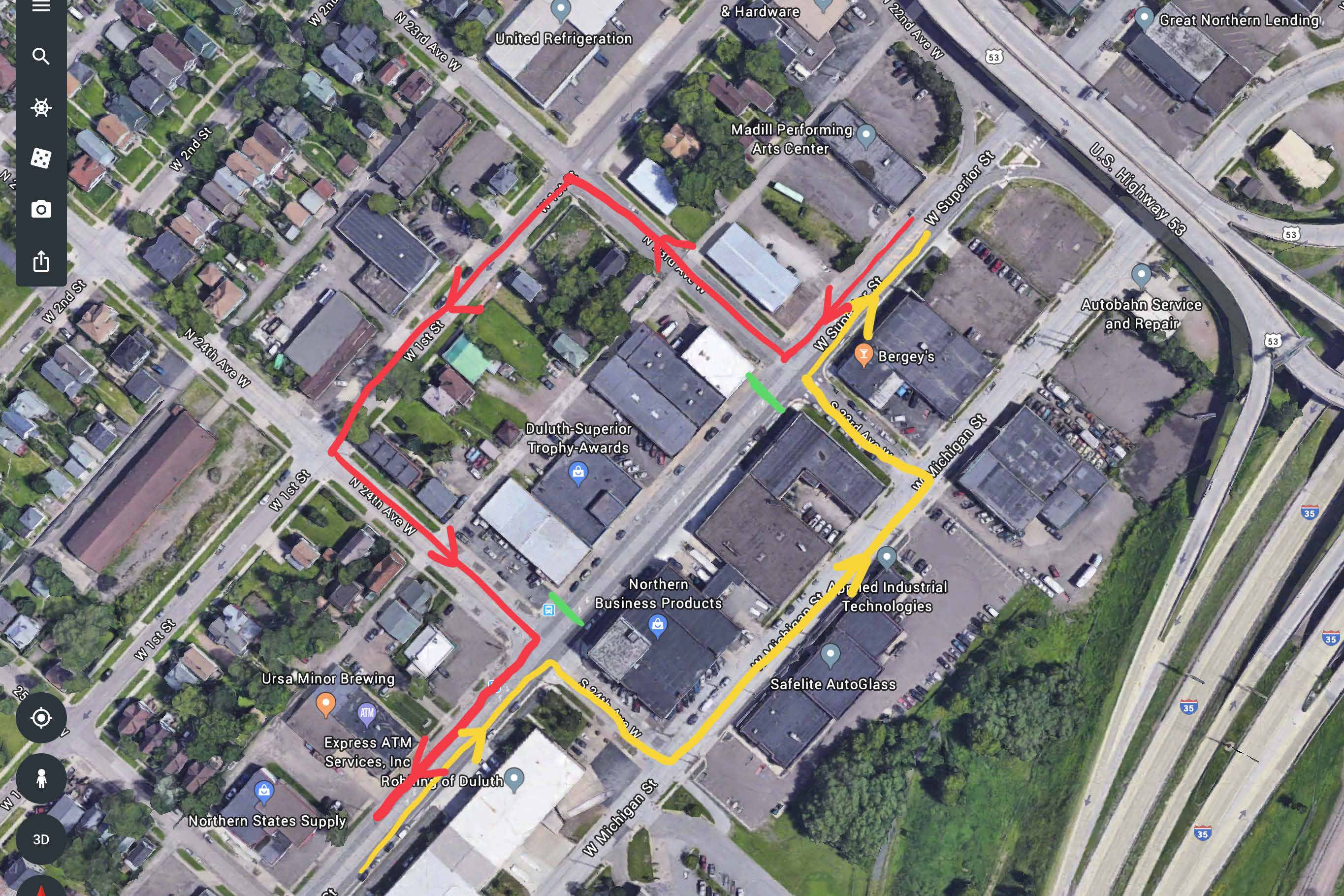 A detour is established for west bound traffic to circulate up to West First Street at 23rd Ave West and east bound traffic to use Michigan Street via access from 24th Ave West. (see map)