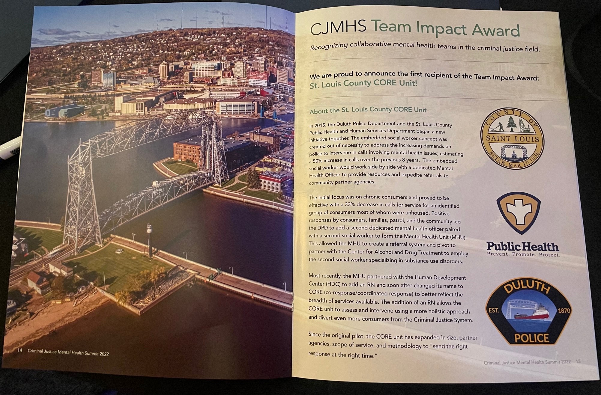 The Duluth Police Department’s Mental Health (CORE) Unit was the first recipient of the Team Impact Award during the 2022 Criminal Justice Mental Health Summit by the Law Enforcement Training Academy and Consulting for being the first mental health collaboration team in the state, being innovative, and helping pave the way for other groups over the years.