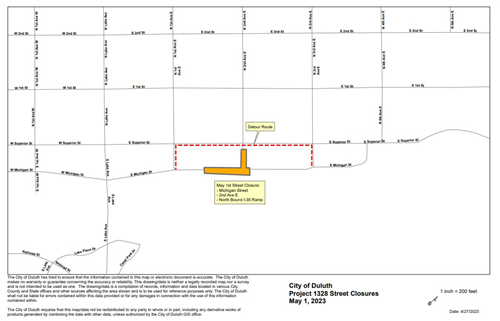 [DULUTH, MN] The City of Duluth’s Engineering Division is announcing upcoming street closures as a part of the Michigan Street Utility Replacement Project beginning May 1. This continuation of a two-year utility replacement project will include closures on Michigan Street from First Avenue East to Second Avenue East and on Second Avenue East from Michigan Street to Superior Street. A detour route (see included map) will be posted for motorists to use Superior Street. The Northbound I-35 ramp at Second Avenue East will also be affected by this closure. The ramp will remain closed until construction is completed later this summer. Sidewalk accessibility will be maintained along Michigan Street, as will vehicle access for local contract vehicle parking.