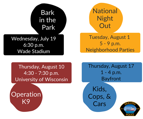 - National Night Out – Tuesday, August 1 from 5 – 9 p.m. at participating neighborhood block parties (https://duluthmn.gov/police/community-policing/national-night-out/)