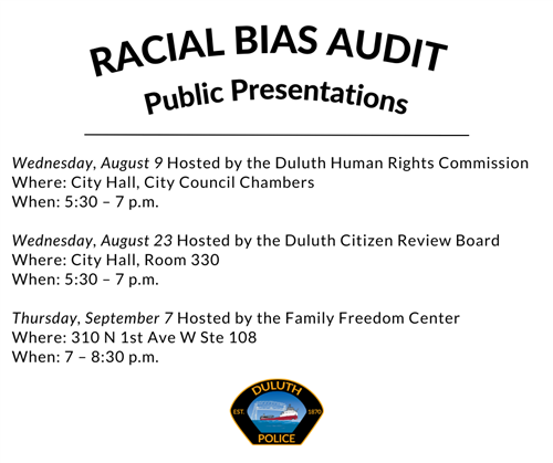 The presentation on Wednesday, August 9 will be recorded and posted on the DPD Racial Bias Audit website (https://duluthmn.gov/police/public-reports-and-transparency/racial-bias-audit/).
