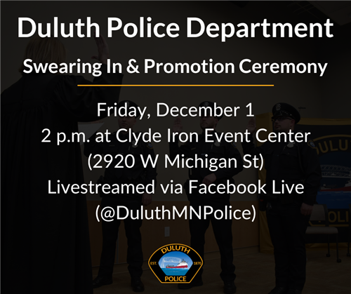 The Swearing-In and Promotion Ceremony will be held at Clyde Iron Event Center (2920 W Michigan St) and it’ll also be live-streamed via Facebook Live (@DuluthMNPolice).