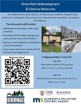 [DULUTH, MN] The City of Duluth, along with state and community partners at the Minnesota Pollution Control Agency, TAB, and Kansas State University, announce their collaborative Brownfield Redevelopment and Cleanup Resources symposiums. Interested parties can join neighborhood business leaders, small businesses, landlords, and government partners for a conversation about resources for redevelopment, brownfields, and property due diligence.
