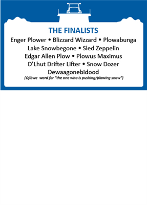 [DULUTH, MN] A field of ten name finalists have been narrowed from a pool of over 300, announced, and are now open for public voting on the City of Duluth website in the city’s first-ever snowplow naming contest. The ten finalist names, in no particular order, are: