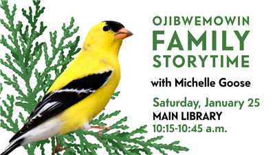 Join us for a special Family Storytime in Ojibwemowin, led by Michelle Goose. We will be reading stories, singing songs, and sharing rhymes in the Ojibwe language. Geared for kids ages 3 -8 years old, but ALL are welcome!