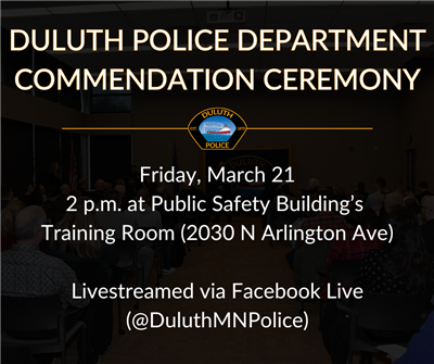 The Duluth Police Department’s Commendation Ceremony will be held on Friday, March 21 at 2:00 p.m. in the Public Safety Building Training Room (2030 North Arlington Avenue).