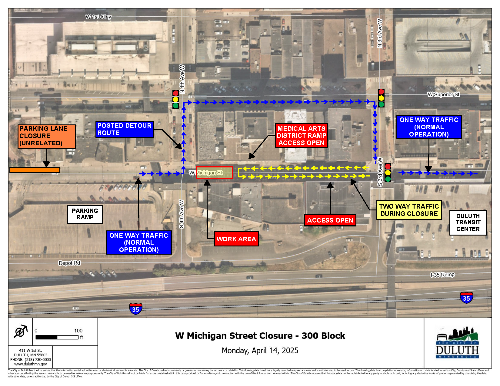 [DULUTH, MN] Contractors will close a portion of the 300 block of West Michigan Street beginning Thursday, April 17, 2025. This closure will be adjacent to the intersection with Fourth Avenue W and a crane will be positioned in the street. This closure is anticipated to occur during daytime working hours and Michigan Street should reopen to normal traffic upon or around the evening rush hour.