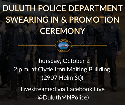 The Swearing-In and Promotion Ceremony will also be live-streamed via Facebook Live (@DuluthMNPolice).